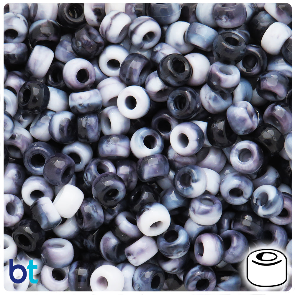 Our black with white marbled finish barrel shaped plastic pony beads, measure 6mm high by 9mm wide and have a 4mm hole which runs vertically down the middle of the bead. These plastic pony beads are imported from China and sold in packs of approx. 300 beads. They may also slightly differ in size from our 9mm barrels that are made in the USA. Pony beads are ideal for a wide variety of projects like; necklaces, bracelets, kandi and dream catchers. The larger hole is easier to thread so makes them perfect for children's parties, activity camps and VBS.