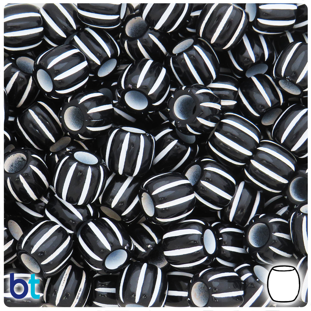 Our black opaque finish barrel shaped plastic craft beads measure 12.4mm wide by 10.9mm high (hole to hole) and have a large 5.5mm hole which runs through the center of the bead. The beads have white details in a vertical stripe pattern. These plastic/acrylic craft beads are imported from China and come in packs of approx. 46 beads. Our printed Craft Beads are ideal for making necklaces, bracelets, key chain and other personalized jewelry projects.