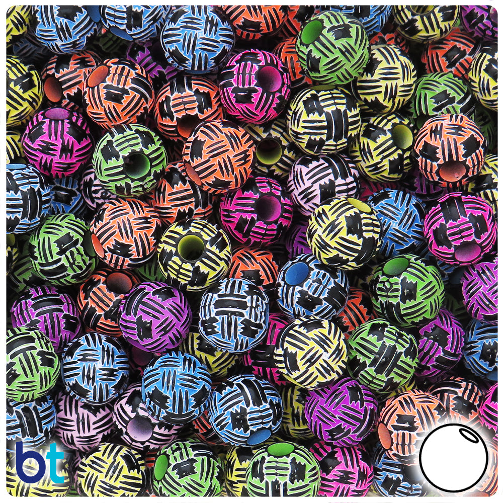 Our black opaque finish round shaped plastic craft beads measure 11.2mm x 10.1mm (hole to hole) and have a large 3.6mm hole which runs through the center of the bead. The beads have colored details featuring a weave pattern . These plastic/acrylic craft beads are imported from China and come in packs of approx. 65 beads. Our printed Craft Beads are ideal for making necklaces, bracelets, key chain and other personalized jewelry projects.