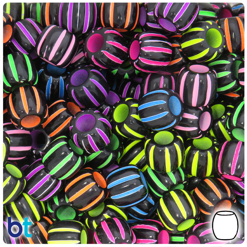 Our black opaque finish barrel shaped plastic craft beads measure 12.4mm wide by 10.9mm high (hole to hole) and have a large 5.5mm hole which runs through the center of the bead. The beads have colored details in a vertical stripe pattern. These plastic/acrylic craft beads are imported from China and come in packs of approx. 46 beads. Our printed Craft Beads are ideal for making necklaces, bracelets, key chain and other personalized jewelry projects.