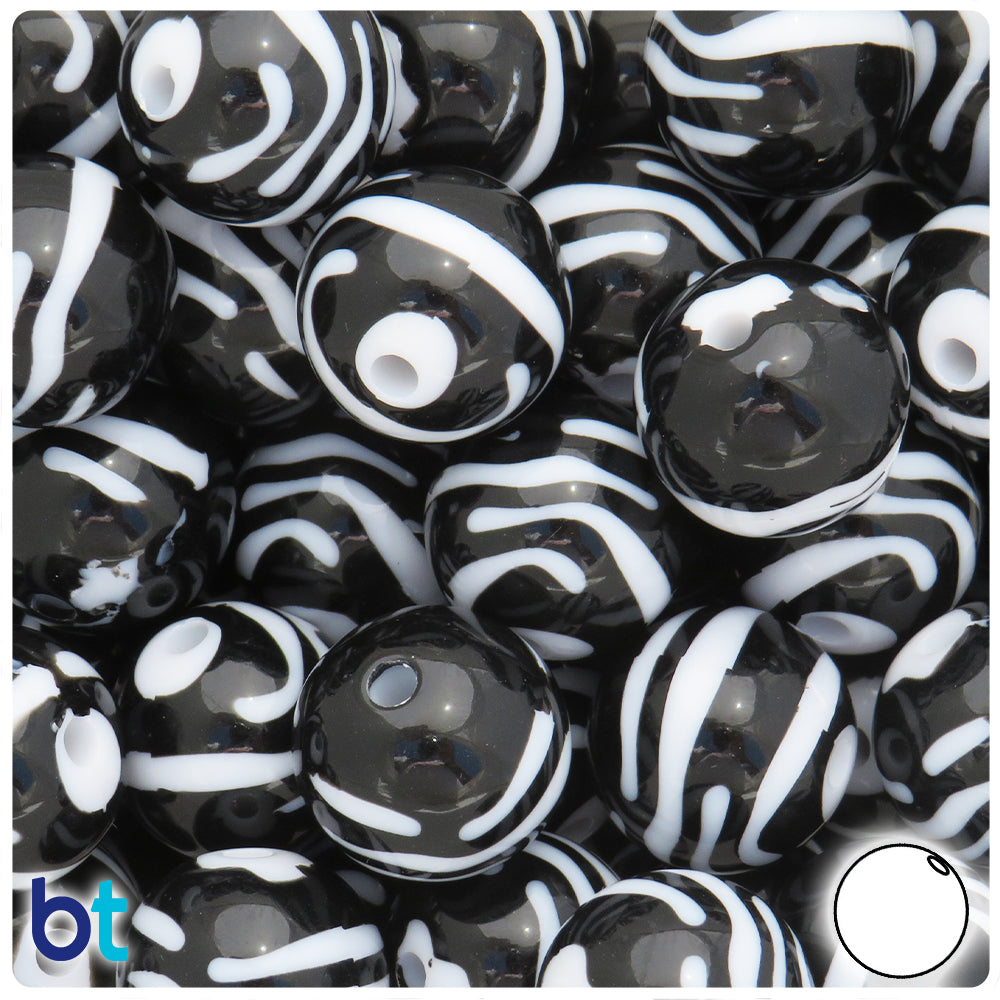 Our black with white zebra stripes, shiny opaque finish round plastic craft beads measure 19mm by 18.3mm (hole to hole) and have a 2.5mm hole which runs through the center of the bead. These plastic craft beads are imported from China and come in packs of approx. 12 beads. Craft Beads are ideal for making necklaces, bracelets, key chain and other jewelry projects, as well as holiday decorations, home bedazzling and many other craft ideas. These chunky style beads are also known as bubblegum beads due to their size