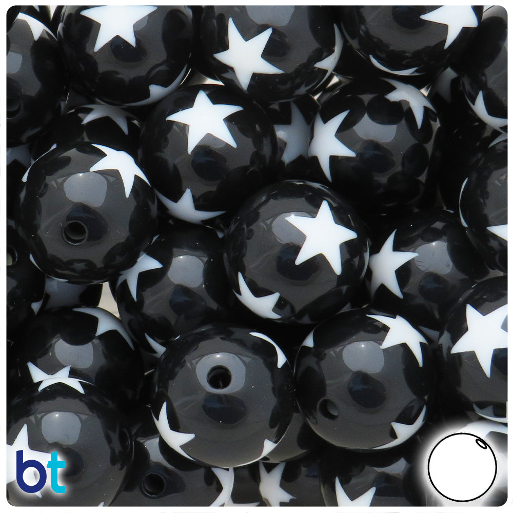 Our black with white stars shiny opaque finish round plastic craft beads measure 20mm diameter and have a 2mm hole which runs through the center of the bead, they are also known as bubblegum beads due to the chunky size. These plastic craft beads are imported from China and come in packs of approx. 10 beads. Craft Beads are ideal for making necklaces, bracelets, key chain and other jewelry projects, as well as holiday decorations, home bedazzling and many other craft ideas. They are also perfect for children's craft projects and church or activity camps.