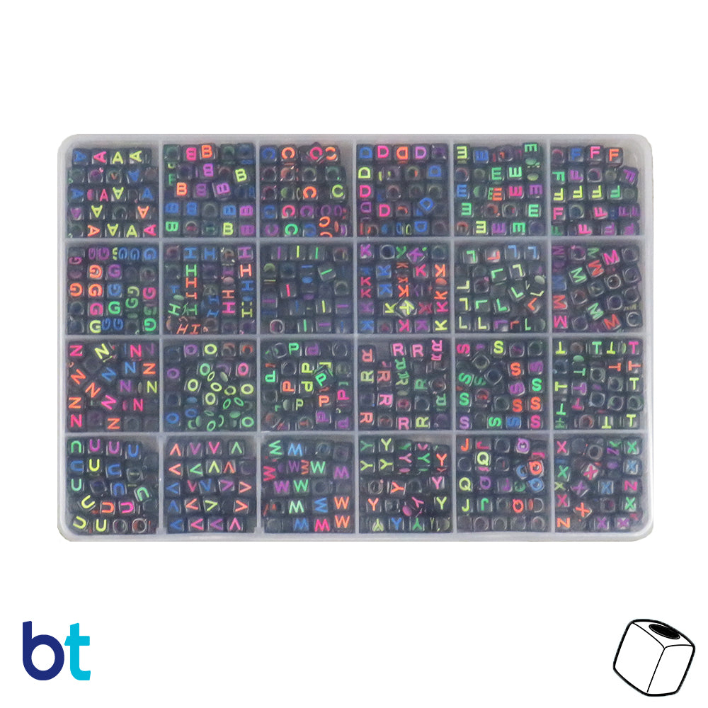 Our black opaque finish cube shaped alphabet plastic beads measure 6.1mm wide by 5.8mm high and have a 3.5mm hole which runs horizontally to the letter which is imprinted on four sides of the beads in various colors. These alpha bead kits are imported from China and have approx. 1000 beads in a re-usable storage container. Our alpha beads are perfect for personalizing necklaces, bracelets, key chains and all manner of kandi designs.