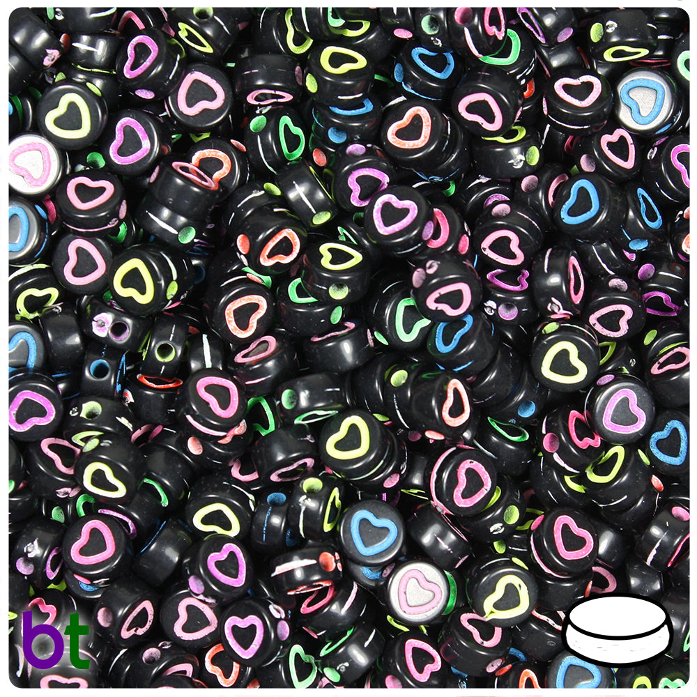 These black opaque 7mm coin alphabet plastic beads have a 1mm hole which runs horizontally to the heart which is imprinted on both sides of the beads in various colors. Imported from China and sold in packs of approx. 250 beads.