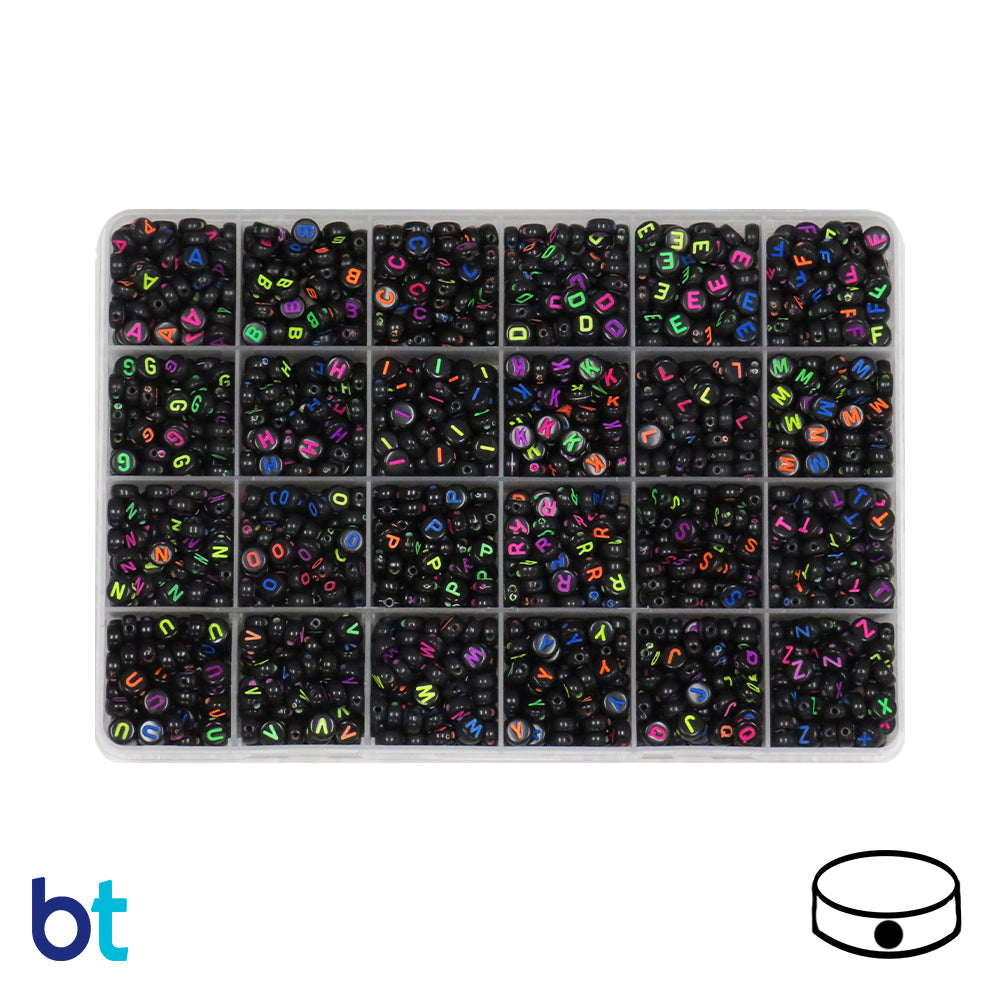 These black opaque finish coin shaped alphabet plastic beads measure 6.8mm by 6.6mm (hole to hole) by 3.4mm thick and have a 1.2mm hole which runs horizontally to the letter which is imprinted on both sides of the beads in various colors. These alpha bead kits are imported from China and sold in packs of approx. 1800 beads and a re-usable storage container. Our alpha beads are perfect for personalizing necklaces, bracelets, key chains and all manner of kandi designs.