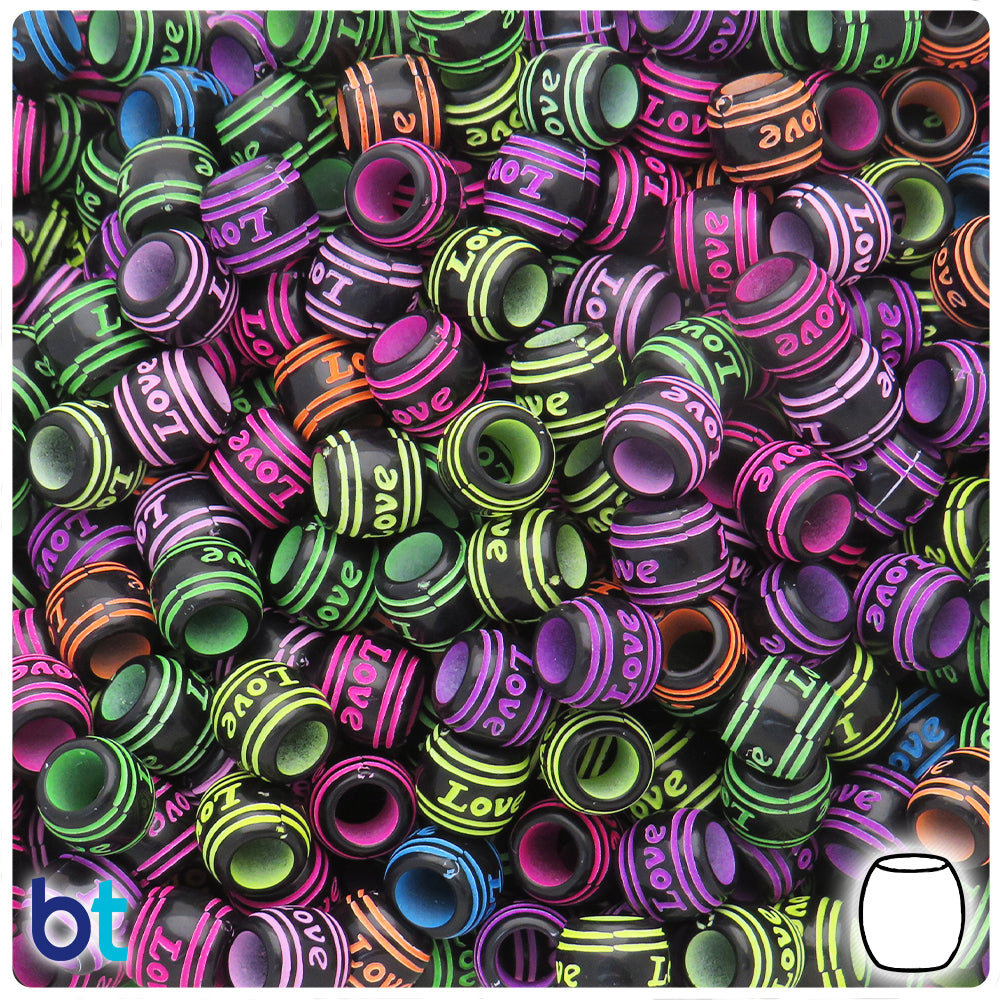 Our black opaque finish barrel shaped plastic craft beads measure 8.7mm wide by 7.8mm high (hole to hole) and have a large 4.5mm hole which runs through the center of the bead. The beads have the word "love" with rings top and bottom printed around the beads in various colors. These plastic/acrylic craft beads are imported from China and come in packs of approx. 160 beads. Our printed Craft Beads are ideal for making necklaces, bracelets, key chain and other personalized jewelry projects.