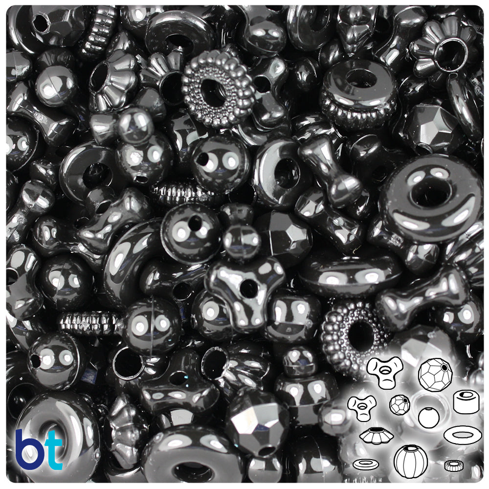 Our plain black, in a shiny opaque finish, mixed bead shaped plastic craft beads in a mixture of rounds, faceted rounds, tribeads, donuts, discs, floral rings, melons, and mini barrels. These craft beads measure between 6mm and 14mm and have both 1mm and 4mm holes. These plastic craft beads are made in the USA with high-quality plastic and come in packs of 4oz approx. 300 beads. Craft Beads are ideal for making necklaces, bracelets, key chain and other jewelry projects, as well as holiday decorations, home bedazzling and many other craft ideas. They are also perfect for children's craft projects and church or activity camps. Craft Beads come with a small 1-2mm hole, so they will fit on a range of threading material like elastic cord, stretchy cord and jewelry wire.