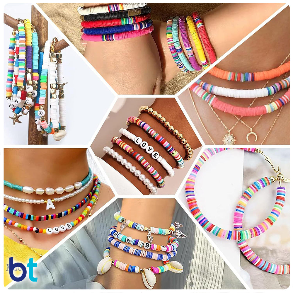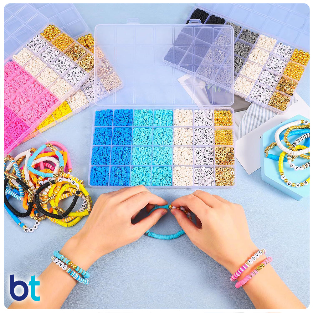 Perfect for creating stylish and unique bracelets. Our Black, White & Grey bracelet kit contains a color co-ordinated mix of polymer clay heishi discs, metallic beads and letter beads enabling you to express your own individual style. This bead box contains approx. 5000 beads plus a length of crystal string. Supplied in a re-usable container with 24 compartments and a securing catch. Made with polymer clay/plastic/acrylic and imported from China.