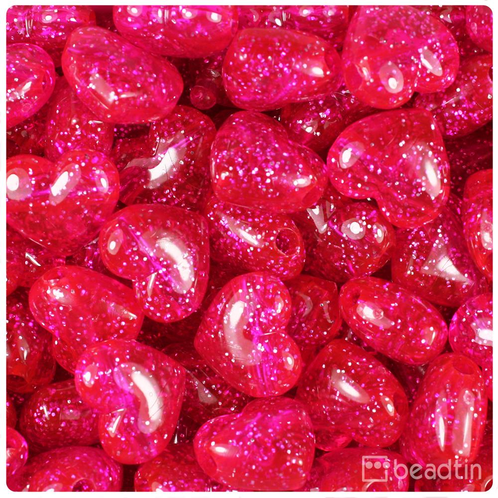 These bright pink sparkle large heart shaped pony beads measure 17mm high by 18mm wide and have a 4mm hole which runs horizontally across middle of the beads. Our plastic pony beads are made in the USA with high-quality plastic and come in packs of approx. 8 beads.