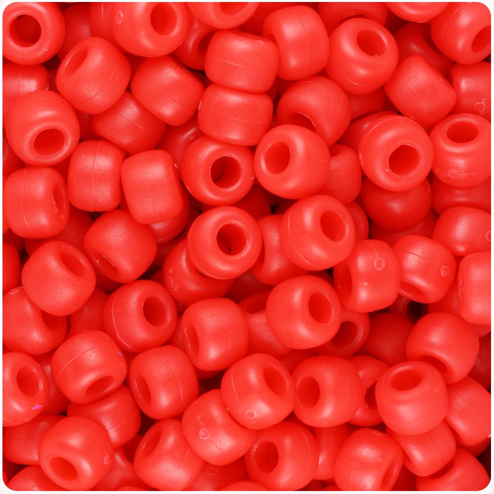 These bright red matte standard barrel pony beads measure 9mm wide by 6mm high and have a 4mm hole which runs vertically down the middle of the beads. Our plastic pony beads are made in the USA with high-quality plastic and come in packs of approx. 100 beads.
