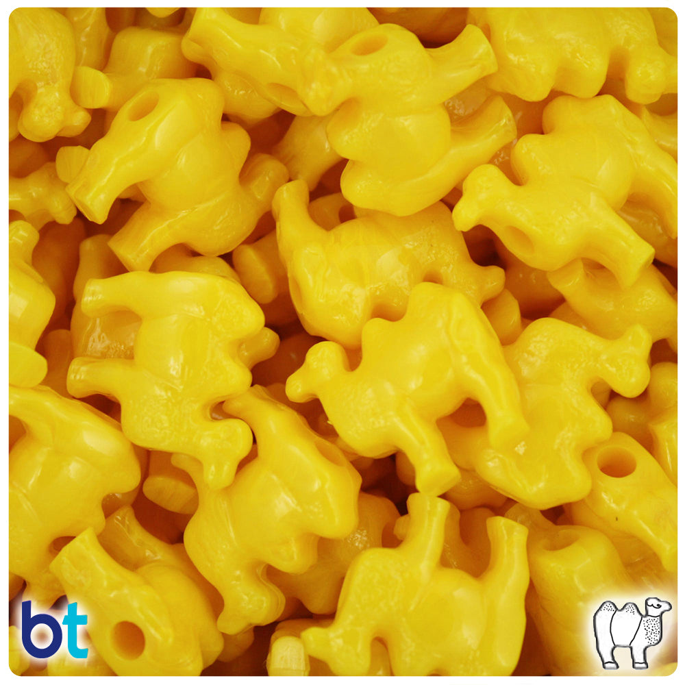 Our bright yellow, in a shiny opaque finish, camel shaped plastic pony beads from the safari animals series. These pony beads measure 21mm long by 19mm high, with a 4mm hole running horizontally across the middle of the bead. These plastic pony beads are made in the USA with high-quality, non-toxic polystyrene plastic and sold in packs of approx. 24 beads. Pony beads are ideal for a wide variety of projects like; necklaces, bracelets, kandi, filler beads and dream catchers. The larger hole is easier to thread so makes them perfect for children's parties, activity camps and VBS.