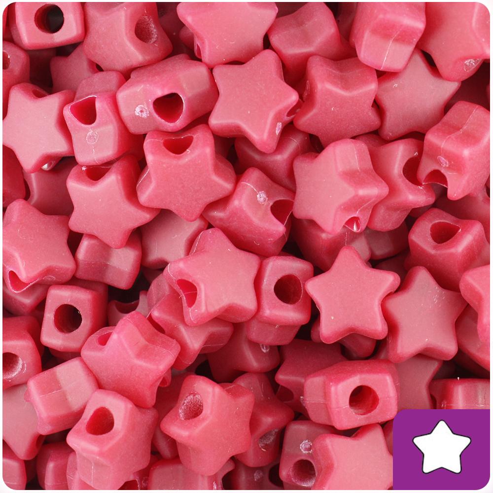 These burgundy red matte star shaped pony beads measure 13mm wide by 13mm high and have a 4mm hole which runs vertically down the middle of the beads. Our plastic pony beads are made in the USA with high-quality plastic and come in packs of approx. 50 beads.