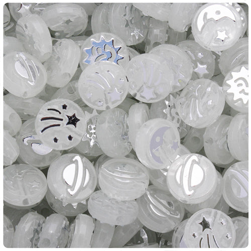 These night glow-in-the-dark celestial picture plastic craft beads measure 13mm diameter, 5mm thick and have a 1.5mm hole. They feature a variety of designs; sun, moon, planet and shooting stars in a silver print. Made in the USA with non-toxic polystyrene plastic and sold in packs of approx 30 beads.