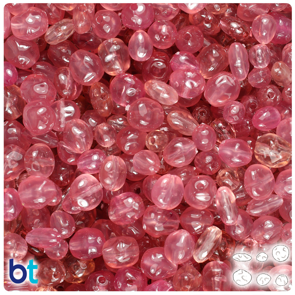 Our cherry quartz pink, in a see through transparent finish, freshwater pearl shaped plastic craft beads. These craft beads measure between 5-10mm in diameter and have a 1mm hole that runs through the center of the bead. These plastic craft beads are made in the USA with high-quality plastic and come in packs of 50g approx. 250 beads. Craft Beads are ideal for making necklaces, bracelets, key chain and other jewelry projects, as well as holiday decorations, home bedazzling and many other craft ideas. They are also perfect for children's craft projects and church or activity camps. Craft Beads come with a small 1-2mm hole, so they will fit on a range of threading material like elastic cord, stretchy cord and jewelry wire.