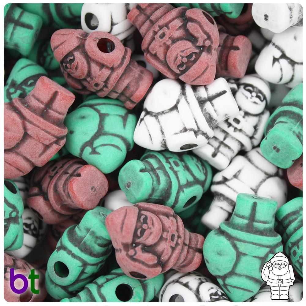 A pack of Christmas color mix antique Santa shaped novelty pony beads from the holiday series. These plastic pony beads measure 17mm wide and 24mm high, with a 4mm hole running horizontally across the middle of the bead. Our pony beads are made in the USA with non-toxic polystyrene plastic and are sold in packs of 8 beads.