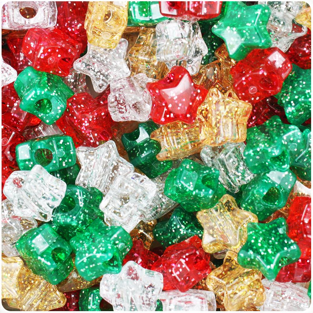 These christmas mix sparkle star shaped pony beads measure 13mm wide by 13mm high and have a 4mm hole which runs vertically down the middle of the beads. Our plastic pony beads are made in the USA with high-quality plastic and come in packs of approx. 50 beads.