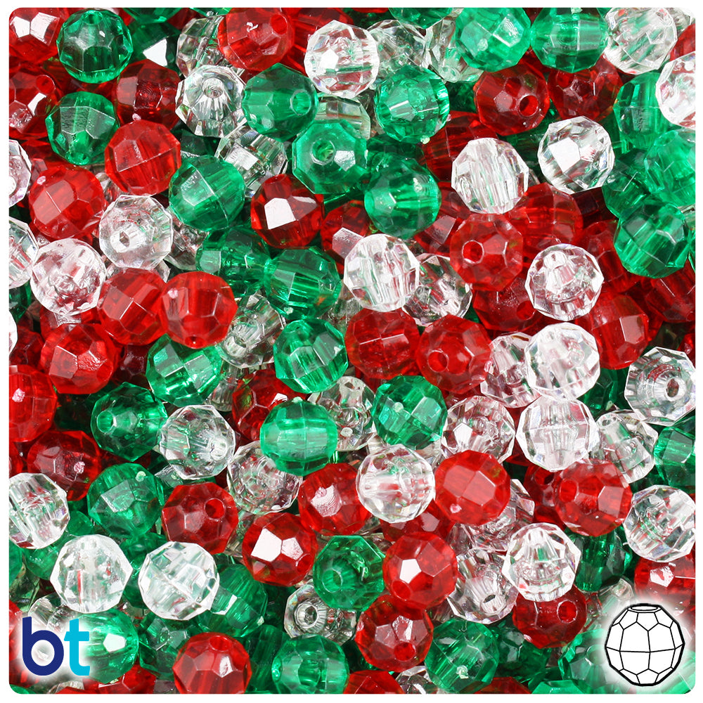 Our Christmas mix, in a see through transparent finish, faceted round plastic craft beads measure 6mm diameter and have a 1.3mm hole which runs through the center of the bead. These plastic craft beads are made in the USA with high-quality non-toxic plastic and come in packs of approx. 600 beads. Craft Beads are ideal for making necklaces, bracelets, key chain and other jewelry projects, as well as holiday decorations, home bedazzling and many other craft ideas. They are also perfect for children's craft projects and church or activity camps. Craft Beads come with a smaller hole, so they will fit on a range of threading material like elastic cord, stretchy cord and jewelry wire.