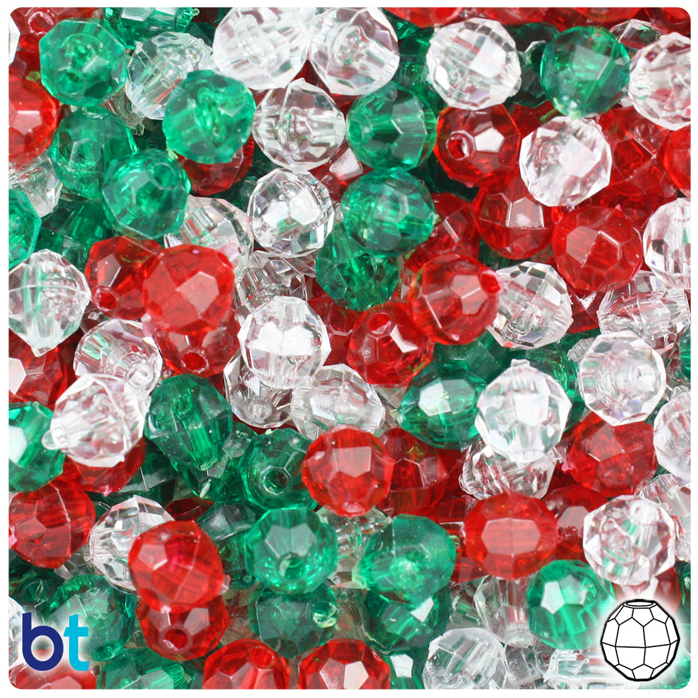 Our Christmas mix, in a see through transparent finish faceted round plastic craft beads measure 8mm diameter and have a 1.5mm hole which runs through the center of the bead. These plastic craft beads are made in the USA with high-quality non-toxic plastic and come in packs of approx. 450 beads. Craft Beads are ideal for making necklaces, bracelets, key chain and other jewelry projects, as well as holiday decorations, home bedazzling and many other craft ideas. They are also perfect for children's craft projects and church or activity camps. Craft Beads come with a smaller hole, so they will fit on a range of threading material like elastic cord, stretchy cord and jewelry wire.