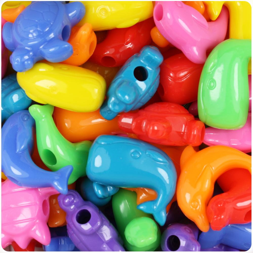 A pack of circus mix opaque marine life shaped novelty pony beads, in a mix of dolphins, seals, whales and sea turtles. These plastic pony beads measure between 23mm and 25mm, all with a 4mm hole running through the bead. Our pony beads are made in the USA with non-toxic polystyrene plastic and are sold in packs of 8 beads.