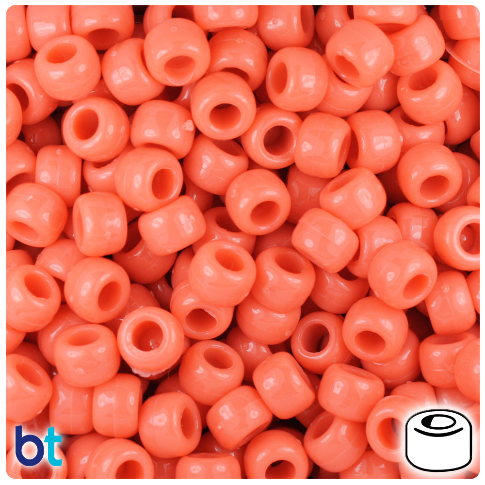 Our coral orange, in a shiny opaque finish barrel shaped plastic pony beads, measure 6mm high by 9mm wide and have a 4mm hole which runs vertically down the middle of the bead. These plastic pony beads are made in the USA with high-quality, non-toxic polystyrene plastic and sold in packs of approx. 500 beads. Pony beads are ideal for a wide variety of projects like; necklaces, bracelets, kandi and dream catchers. The larger hole is easier to thread so makes them perfect for children's parties, activity camps and VBS.