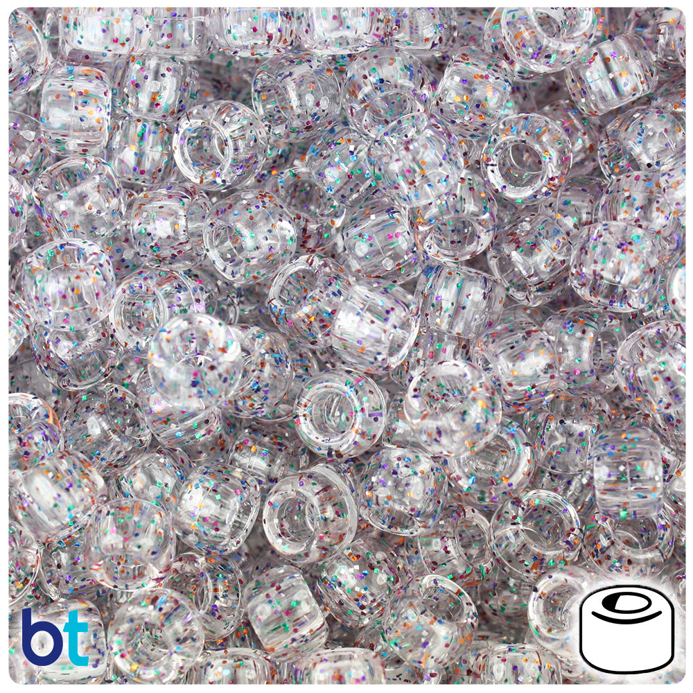 Our crystal clear, in a glittery rainbow sparkle finish barrel shaped plastic pony beads, measure 6mm high by 9mm wide and have a 4mm hole which runs vertically down the middle of the bead. These plastic pony beads are made in the USA with high-quality, non-toxic polystyrene plastic and sold in packs of approx. 100 beads. Pony beads are ideal for a wide variety of projects like; necklaces, bracelets, kandi and dream catchers. The larger hole is easier to thread so makes them perfect for children's parties, activity camps and VBS.