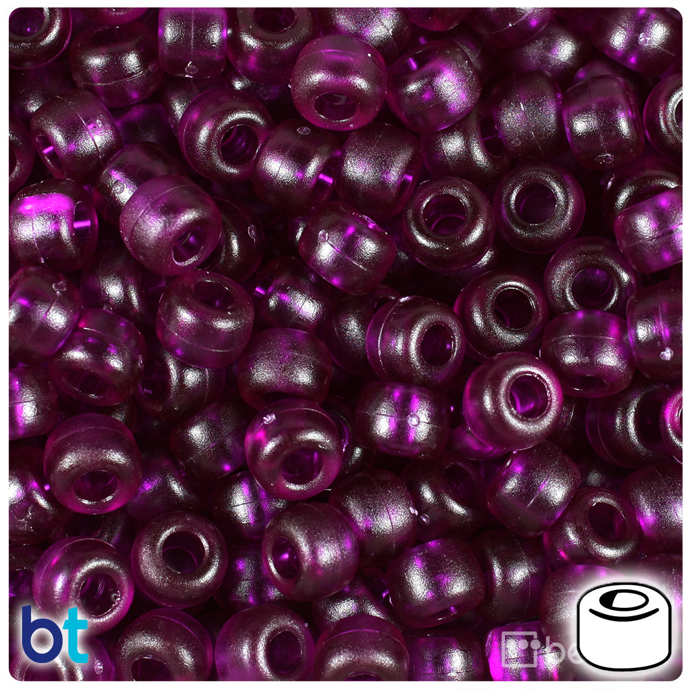 Our dark amethyst purple, in a textured frosted finish barrel shaped plastic pony beads, measure 6mm high by 9mm wide and have a 4mm hole which runs vertically down the middle of the bead. These plastic pony beads are made in the USA with high-quality, non-toxic polystyrene plastic and sold in packs of approx. 500 beads. Pony beads are ideal for a wide variety of projects like; necklaces, bracelets, kandi and dream catchers. The larger hole is easier to thread so makes them perfect for children's parties, activity camps and VBS.