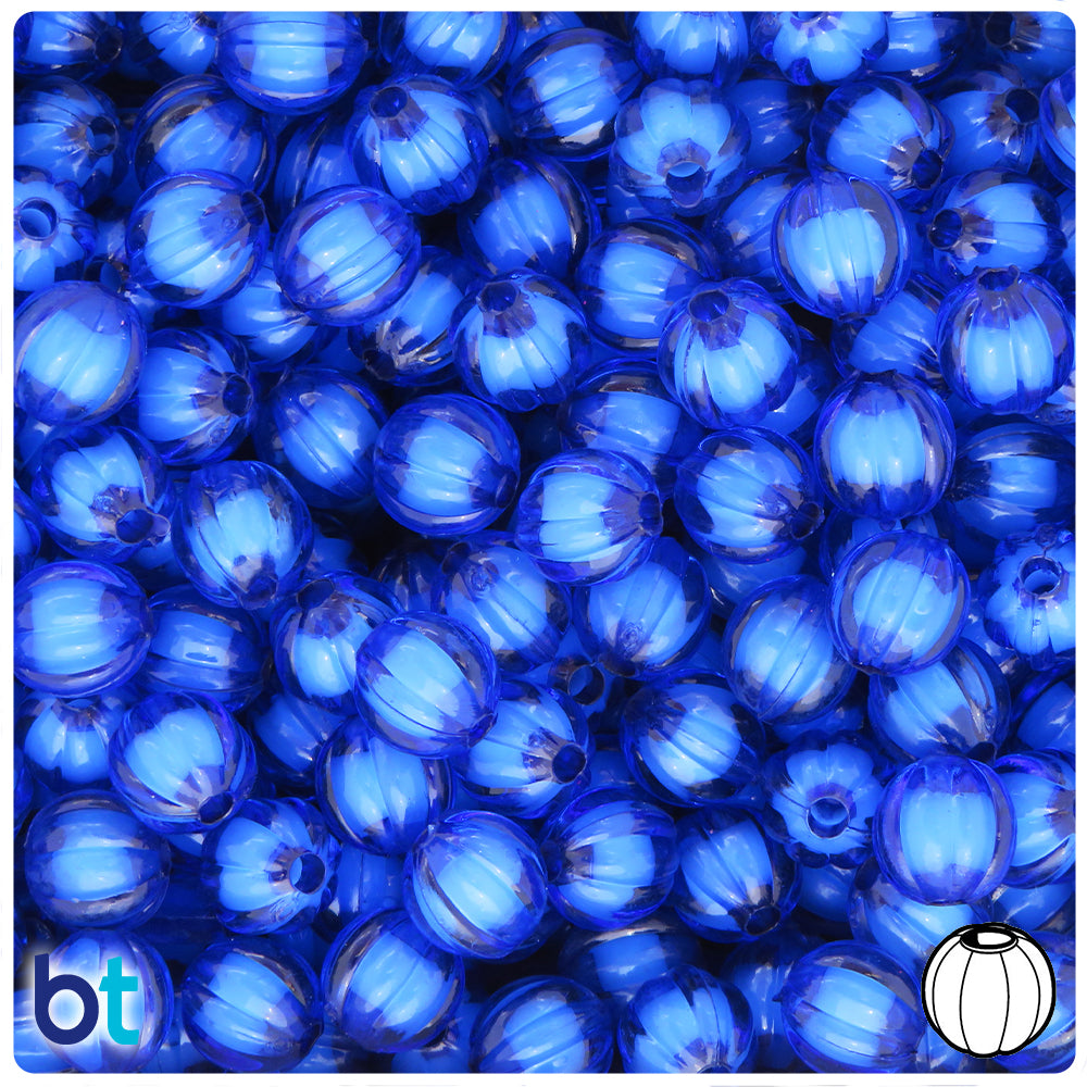 These dark blue transparent melon shaped acrylic beads measure 10mm diameter with a 1.5mm hole which runs through the center of the bead. Bead In Beads have a smaller white bead molded inside of the transparent color, which gives them a 3D effect. These acrylic craft beads are imported from China and are sold in packs of approx. 100 beads.