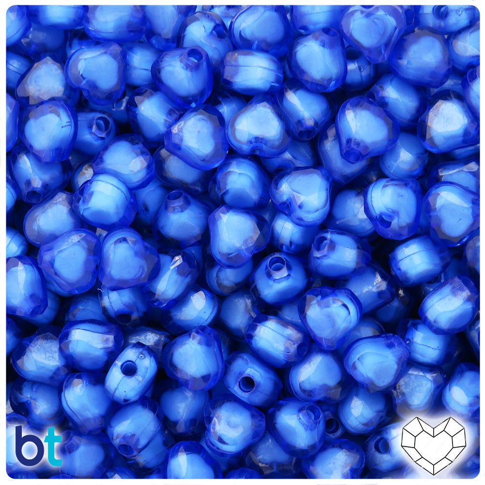 Our Dark Blue transparent faceted heart shaped plastic craft beads, measure 9.9mm wide by 9.5mm high by 6mm thick and have a 1.5mm hole which runs vertically down the middle of the bead. These beads have a white opaque inner core and are known as bead-in-beads. These faceted heart beads are made in the China and sold in packs of approx. 150 beads. Craft beads are ideal for a wide variety of projects like; necklaces, bracelets, kandi and Valentine designs, as well as decor bedazzling..