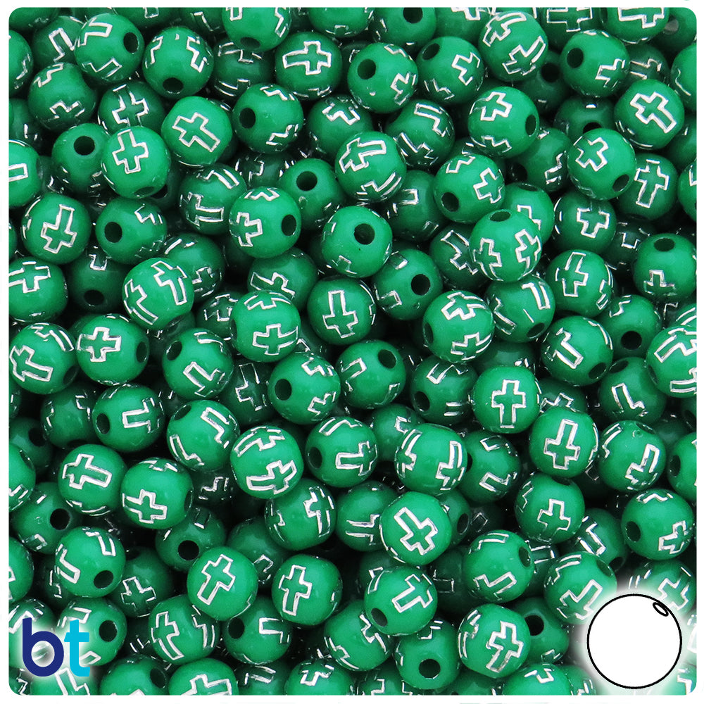 Our dark green opaque finish round plastic accent craft beads measure 8mm diameter and have a 1.2mm hole which runs through the center of the bead. These beads are imported from China, featuring silver accent crosses which are imprinted around the bead and come in packs of approx. 150 beads. Craft Beads are ideal for making necklaces, bracelets, key chain and other jewelry projects, as well as holiday decorations, home bedazzling and many other craft ideas. They are also perfect for children's craft projects and church or activity camps. Craft Beads come with a small 1-2mm hole, so they will fit on a range of threading material like elastic cord, stretchy cord and jewelry wire.