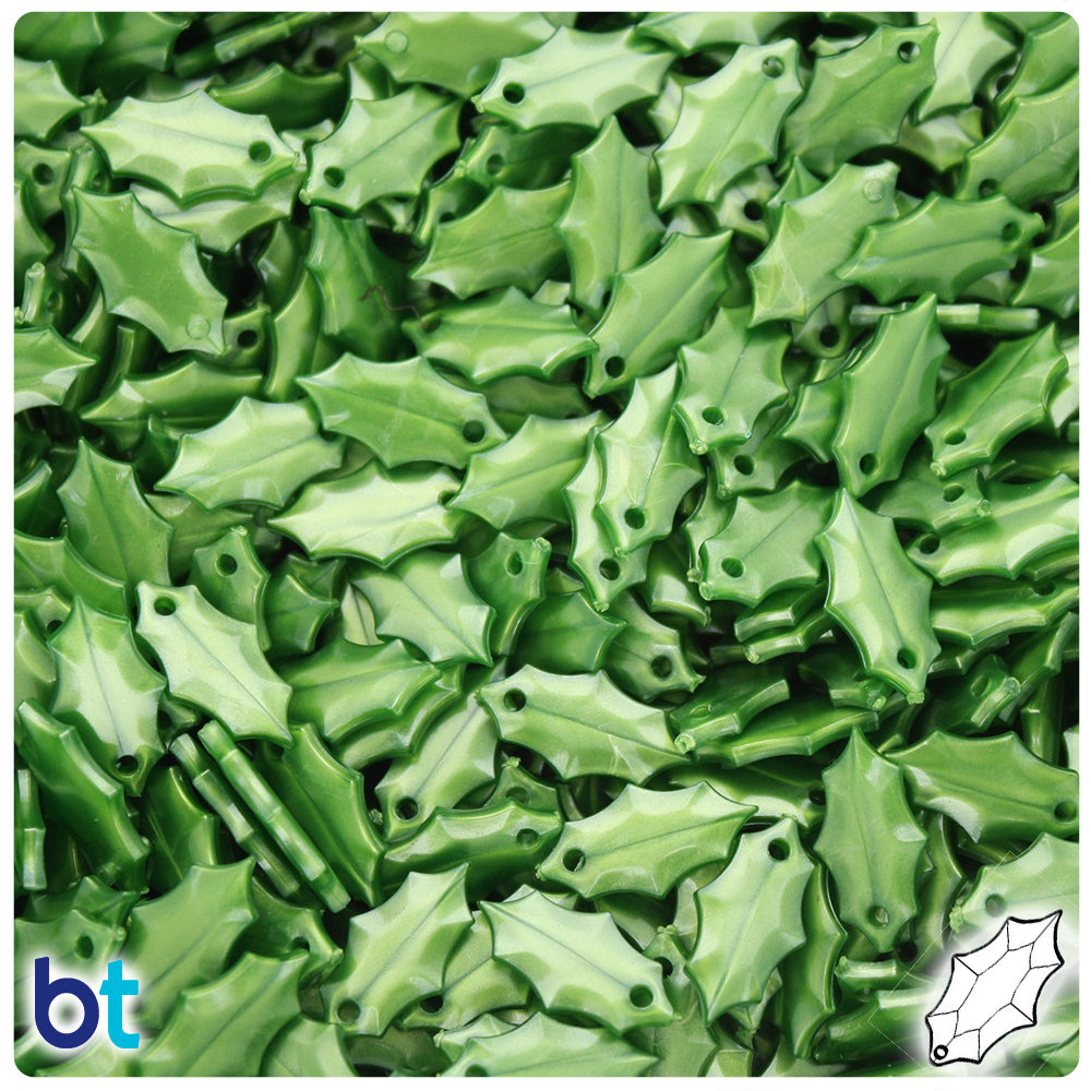 Our dark green, in a shimmering pearl finish, holly leaves shaped plastic craft beads. These craft beads measure 14mm long by 7.5mm wide and have a 1mm hole in the end of the leaf. These plastic craft beads are made in the USA with high-quality plastic and come in packs of approx. 120 beads. Craft Beads are ideal for making necklaces, bracelets, key chain and other jewelry projects, as well as holiday decorations, home bedazzling and many other craft ideas. They are also perfect for children's craft projects and church or activity camps. Craft Beads come with a small 1-2mm hole, so they will fit on a range of threading material like elastic cord, stretchy cord and jewelry wire.