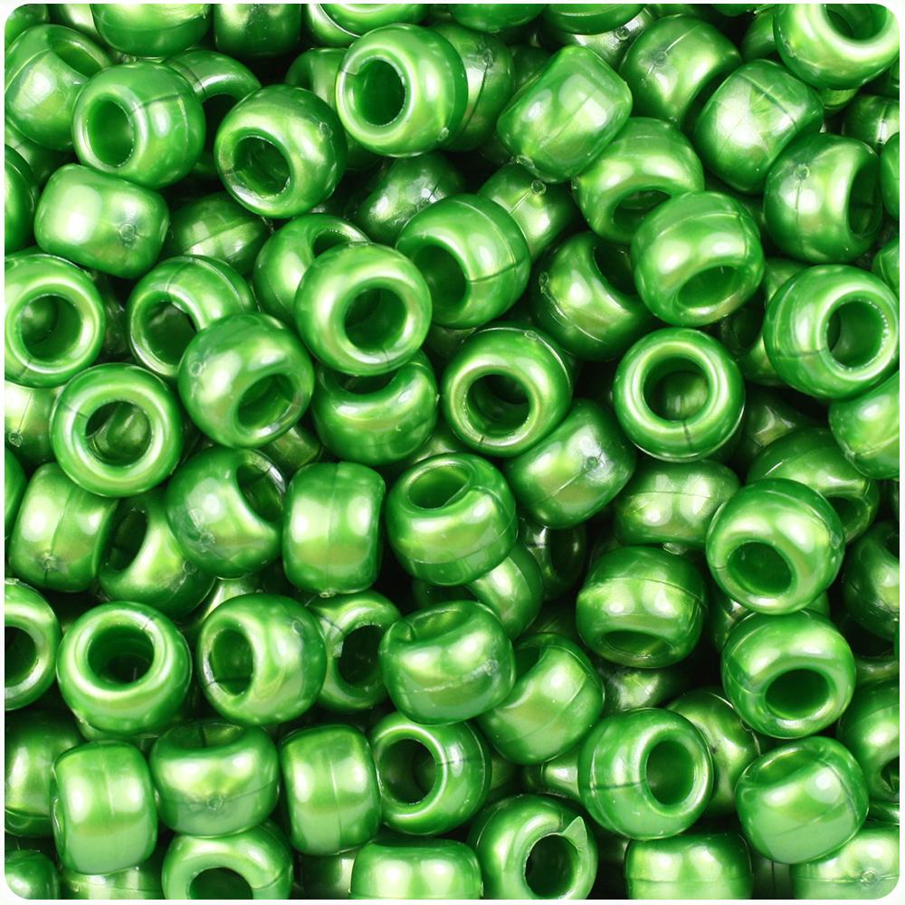 These dark green shimmering pearl standard barrel pony beads measure 9mm wide by 6mm high and have a 4mm hole which runs vertically down the middle of the beads. Our plastic pony beads are made in the USA with high-quality plastic and come in packs of approx. 100 beads.