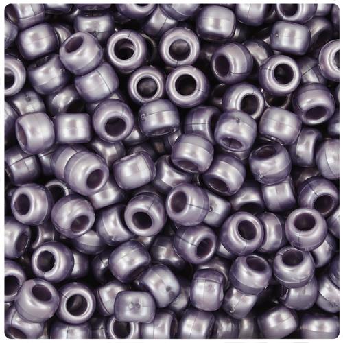 These dark lavender purple shimmering pearl standard barrel pony beads measure 9mm wide by 6mm high and have a 4mm hole which runs vertically down the middle of the beads. Our plastic pony beads are made in the USA with high-quality plastic and come in packs of approx. 100 beads.