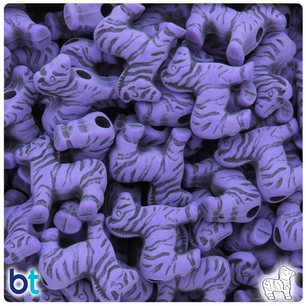 Our dark lilac purple, with a black detailed antique finish, zebra shaped plastic pony beads from the safari animals series. These pony beads measure 22mm long and 20mm high, with a 4mm hole running horizontally across the middle of the bead. These plastic pony beads are made in the USA with high-quality, non-toxic polystyrene plastic and sold in packs of approx. 24 beads. Pony beads are ideal for a wide variety of projects like; necklaces, bracelets, kandi, filler beads and dream catchers. The larger hole is easier to thread so makes them perfect for children's parties, activity camps and VBS.