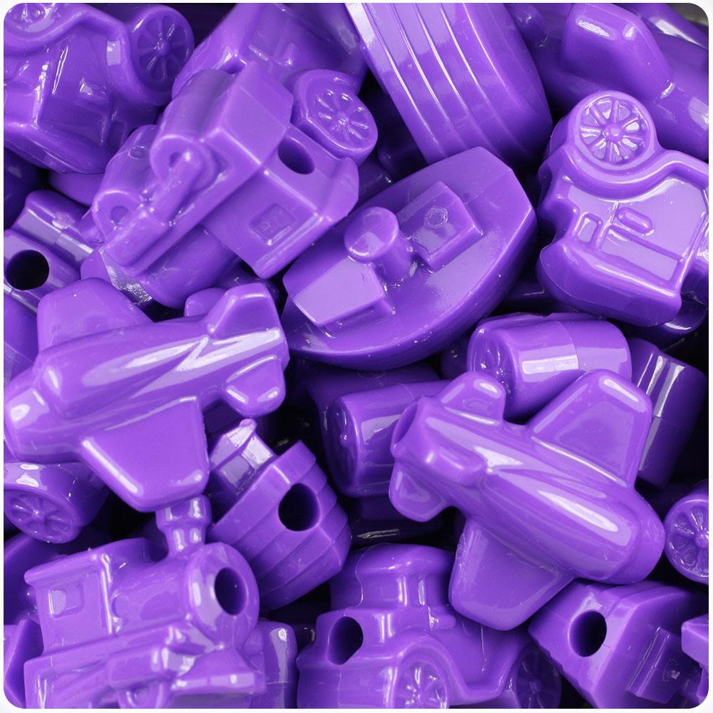 These dark lilac purple opaque mini mobile shaped pony beads in a mix of planes, trains, cars and boats. Measuring between 22mm and 25mm with a 4mm hole which runs down the middle of the beads. These plastic novelty pony beads are made in the USA with high-quality plastic and come in packs of 8 beads.