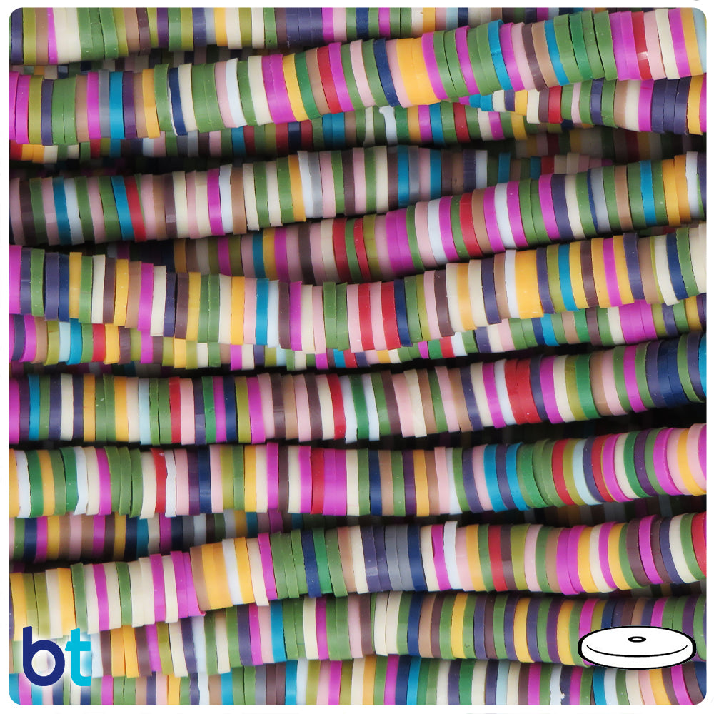 These dark mix opaque polymer clay heishi disc craft beads measure 6mm diameter, about 1mm thick and have a 2mm center hole. Our polymer clay craft beads are imported from China and these come in packs of approx. 700 beads.