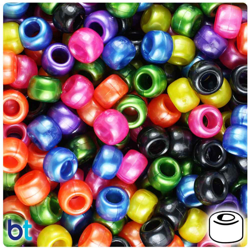 Our dark mix, in a shimmering pearl finish barrel shaped plastic pony beads, measure 6mm high by 9mm wide and have a 4mm hole which runs vertically down the middle of the bead. These plastic pony beads are made in the USA with high-quality, non-toxic polystyrene plastic and sold in packs of approx. 500 beads. Pony beads are ideal for a wide variety of projects like; necklaces, bracelets, kandi and dream catchers. The larger hole is easier to thread so makes them perfect for children's parties, activity camps and VBS.