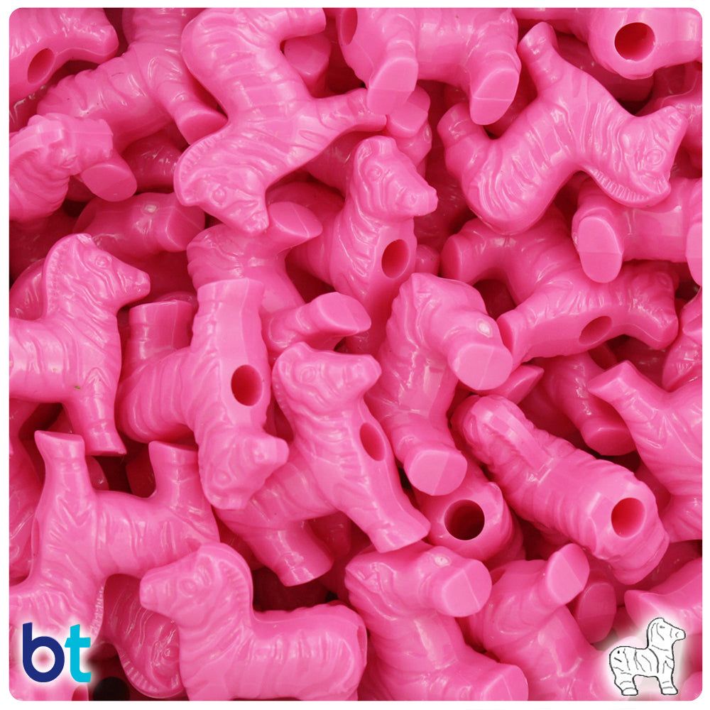 Our dark or hot pink, in a shiny opaque finish, zebra shaped plastic pony beads from the safari animals series. These pony beads measure 22mm long and 20mm high, with a 4mm hole running horizontally across the middle of the bead. These plastic pony beads are made in the USA with high-quality, non-toxic polystyrene plastic and sold in packs of approx. 24 beads. Pony beads are ideal for a wide variety of projects like; necklaces, bracelets, kandi, filler beads and dream catchers. The larger hole is easier to thread so makes them perfect for children's parties, activity camps and VBS.