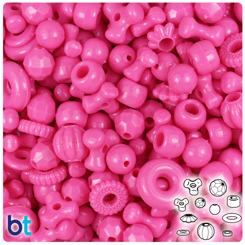 Our dark or hot pink, in a shiny opaque finish, mixed bead shaped plastic craft beads in a mixture of rounds, faceted rounds, tribeads, donuts, discs, floral rings, melons, and mini barrels. These craft beads measure between 6mm and 14mm and have both 1mm and 4mm holes. These plastic craft beads are made in the USA with high-quality plastic and come in packs of 4oz approx. 300 beads. Craft Beads are ideal for making necklaces, bracelets, key chain and other jewelry projects, as well as holiday decorations, home bedazzling and many other craft ideas. They are also perfect for children's craft projects and church or activity camps. Craft Beads come with a small 1-2mm hole, so they will fit on a range of threading material like elastic cord, stretchy cord and jewelry wire.
