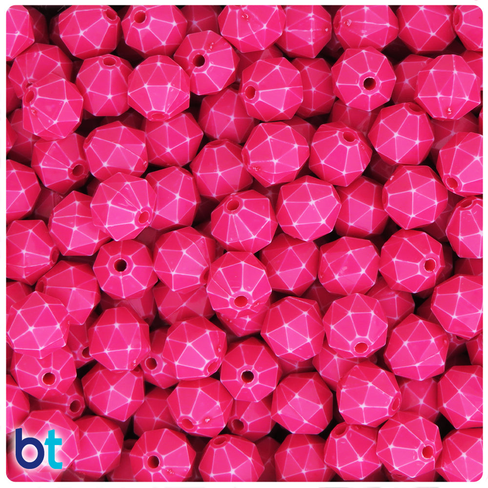 These dark pink opaque with a chemical white wash effect faceted polygon or cube acrylic beads measure approx. 10mm wide with a 1.5mm hole which runs vertically down the middle of the bead. Our acrylic craft beads are imported from China and these come in packs of approx. 100 beads.