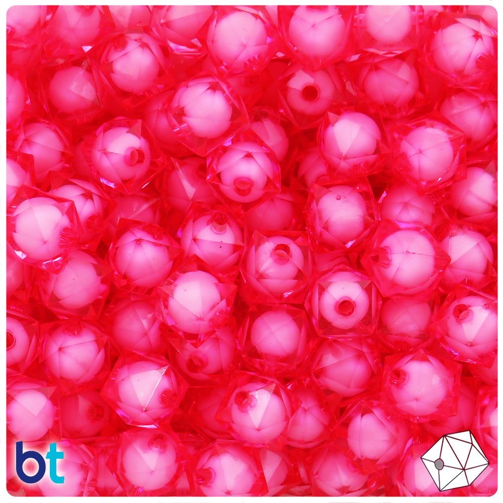 Our dark pink transparent faceted cube, with a white opaque centre ball, plastic craft beads measure 12mm wide by 11m high and have a 1.5mm hole which runs horizontally through the center of the bead, they are also known as bead in beads. These plastic craft beads are imported from China and come in packs of approx. 80 beads. Craft Beads are ideal for making necklaces, bracelets, key chain and other jewelry projects, as well as holiday decorations, home bedazzling and many other craft ideas. They are also perfect for children's craft projects and church or activity camps. Craft Beads come with a small 1-2mm hole, so they will fit on a range of threading material like elastic cord, stretchy cord and jewelry wire.