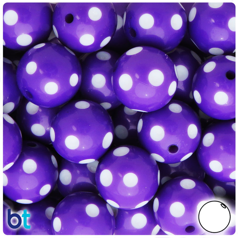 Our dark purple with white polka dots shiny opaque finish round plastic craft beads measure 20mm diameter and have a 2mm hole which runs through the center of the bead, they are also known as bubblegum beads due to the chunky size. These plastic craft beads are imported from China and come in packs of approx. 10 beads. Craft Beads are ideal for making necklaces, bracelets, key chain and other jewelry projects, as well as holiday decorations, home bedazzling and many other craft ideas. They are also perfect for children's craft projects and church or activity camps.