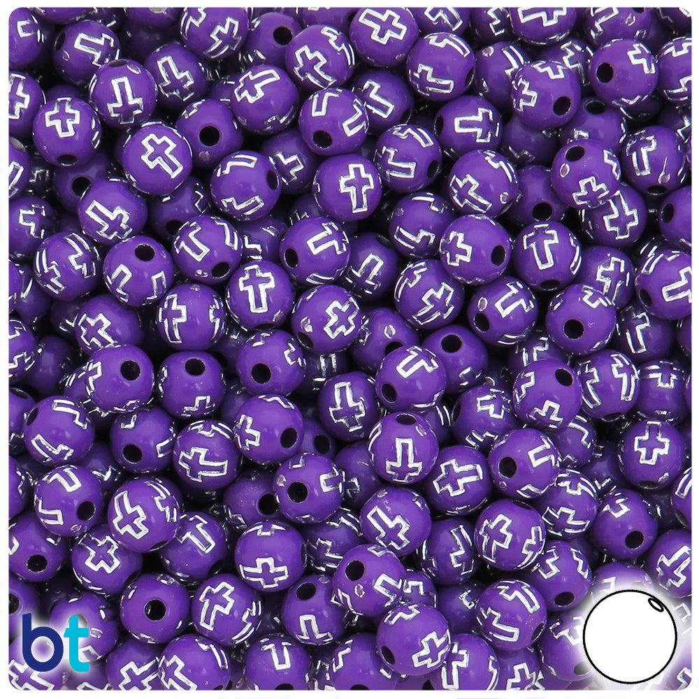 Our dark purple opaque finish round plastic accent craft beads measure 8mm diameter and have a 1.2mm hole which runs through the center of the bead. These beads are imported from China, featuring silver accent crosses which are imprinted around the bead and come in packs of approx. 150 beads. Craft Beads are ideal for making necklaces, bracelets, key chain and other jewelry projects, as well as holiday decorations, home bedazzling and many other craft ideas. They are also perfect for children's craft projects and church or activity camps. Craft Beads come with a small 1-2mm hole, so they will fit on a range of threading material like elastic cord, stretchy cord and jewelry wire.