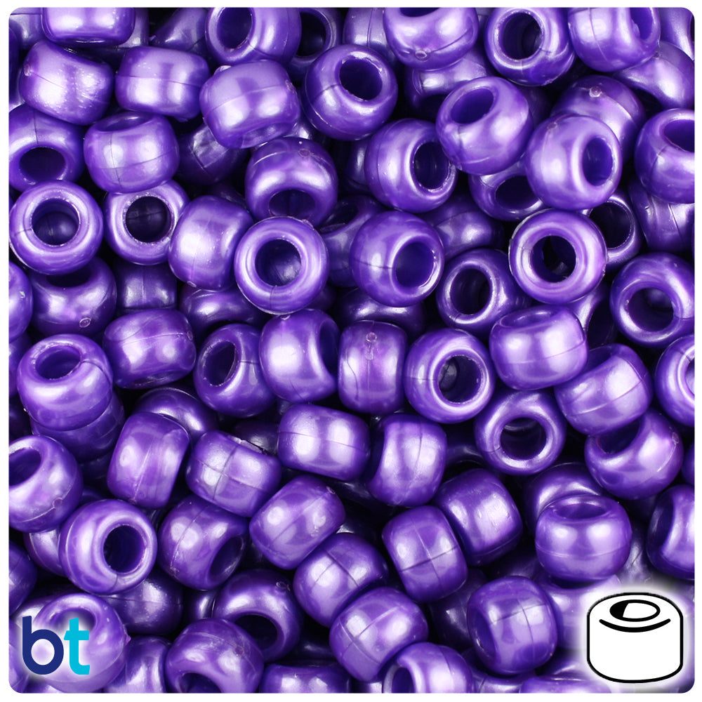 Our dark purple, in a shimmering pearl finish barrel shaped plastic pony beads, measure 6mm high by 9mm wide and have a 4mm hole which runs vertically down the middle of the bead. These plastic pony beads are made in the USA with high-quality, non-toxic polystyrene plastic and sold in packs of approx. 500 beads. Pony beads are ideal for a wide variety of projects like; necklaces, bracelets, kandi and dream catchers. The larger hole is easier to thread so makes them perfect for children's parties, activity camps and VBS.
