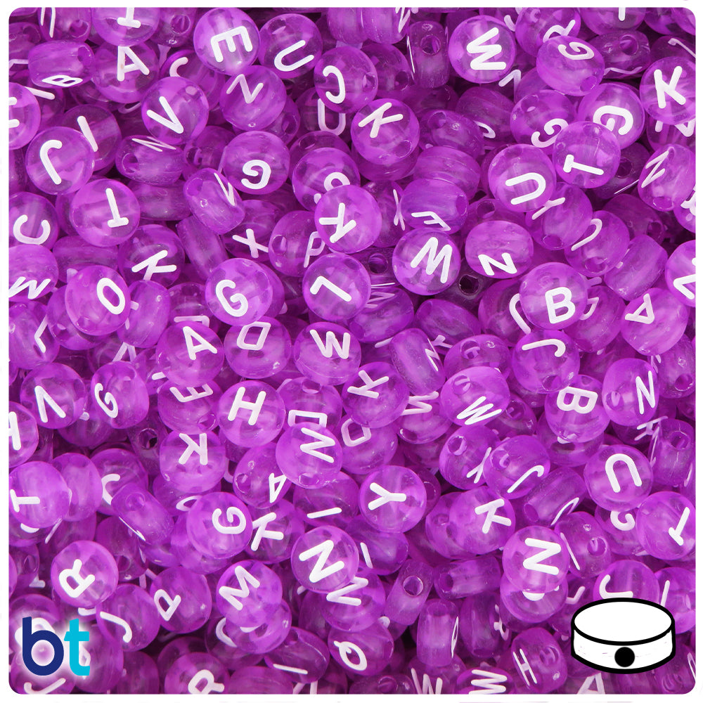 These dark purple transparent coin shaped alphabet plastic beads measure 7mm diameter by 4mm thick and have a 1mm hole which runs horizontally to the letter which is imprinted on both sides of the beads in white. This pack contains a random mix of letters. These craft beads are imported from China and sold in packs of approx. 250 beads. Our alpha beads are perfect for personalizing necklaces, bracelets, key chains and all manner of kandi designs.
