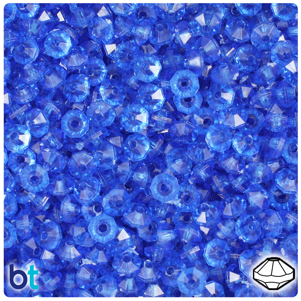 Our dark sapphire blue, in a see through transparent finish, faceted round plastic craft beads measure 6mm wide and 4mm high and at the highest point a 1mm hole which runs through the center of the bead. These plastic craft beads are made in the USA with high-quality non-toxic plastic and come in packs of approx. 1350 beads. Craft Beads are ideal for making necklaces, bracelets, key chain and other jewelry projects, as well as holiday decorations, home bedazzling and many other craft ideas. They are also perfect for children's craft projects and church or activity camps. Craft Beads come with a smaller hole, so they will fit on a range of threading material like elastic cord, stretchy cord and jewelry wire.