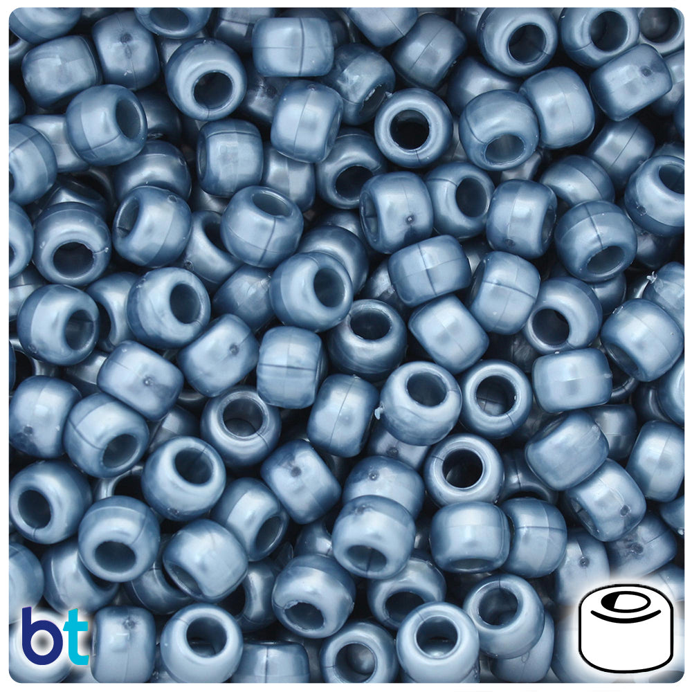 Our dark steel blue, in a shimmering pearl finish barrel shaped plastic pony beads, measure 6mm high by 9mm wide and have a 4mm hole which runs vertically down the middle of the bead. These plastic pony beads are made in the USA with high-quality, non-toxic polystyrene plastic and sold in packs of approx. 500 beads. Pony beads are ideal for a wide variety of projects like; necklaces, bracelets, kandi and dream catchers. The larger hole is easier to thread so makes them perfect for children's parties, activity camps and VBS.