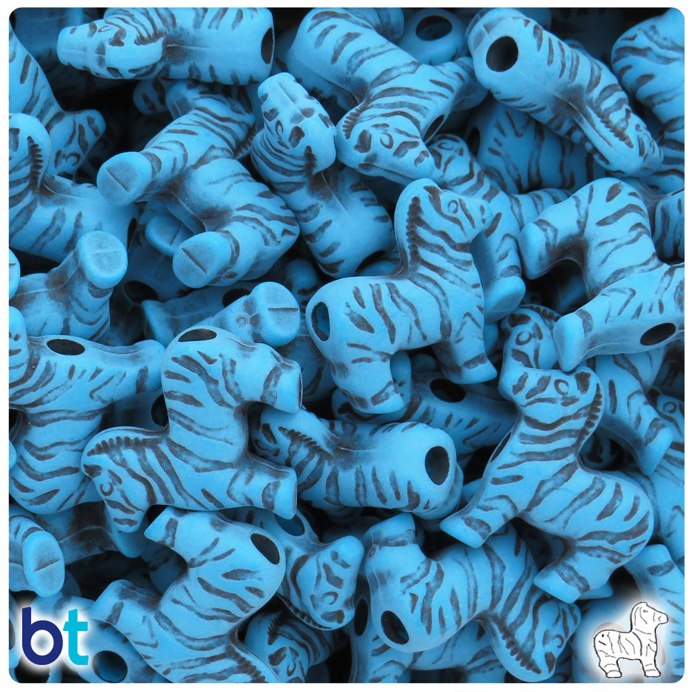 Our dark turquoise blue, with a black detailed antique finish, zebra shaped plastic pony beads from the safari animals series. These pony beads measure 22mm long and 20mm high, with a 4mm hole running horizontally across the middle of the bead. These plastic pony beads are made in the USA with high-quality, non-toxic polystyrene plastic and sold in packs of approx. 24 beads. Pony beads are ideal for a wide variety of projects like; necklaces, bracelets, kandi, filler beads and dream catchers. The larger hole is easier to thread so makes them perfect for children's parties, activity camps and VBS.