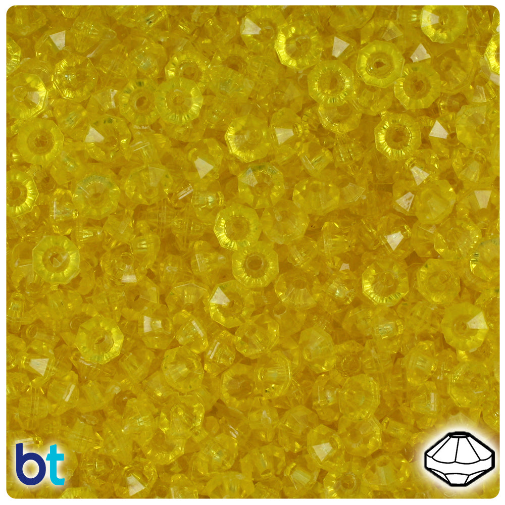 Our dark yellow, in a see through transparent finish, faceted round plastic craft beads measure 6mm wide and 4mm high and at the highest point a 1mm hole which runs through the center of the bead. These plastic craft beads are made in the USA with high-quality non-toxic plastic and come in packs of approx. 1350 beads. Craft Beads are ideal for making necklaces, bracelets, key chain and other jewelry projects, as well as holiday decorations, home bedazzling and many other craft ideas. They are also perfect for children's craft projects and church or activity camps. Craft Beads come with a smaller hole, so they will fit on a range of threading material like elastic cord, stretchy cord and jewelry wire.