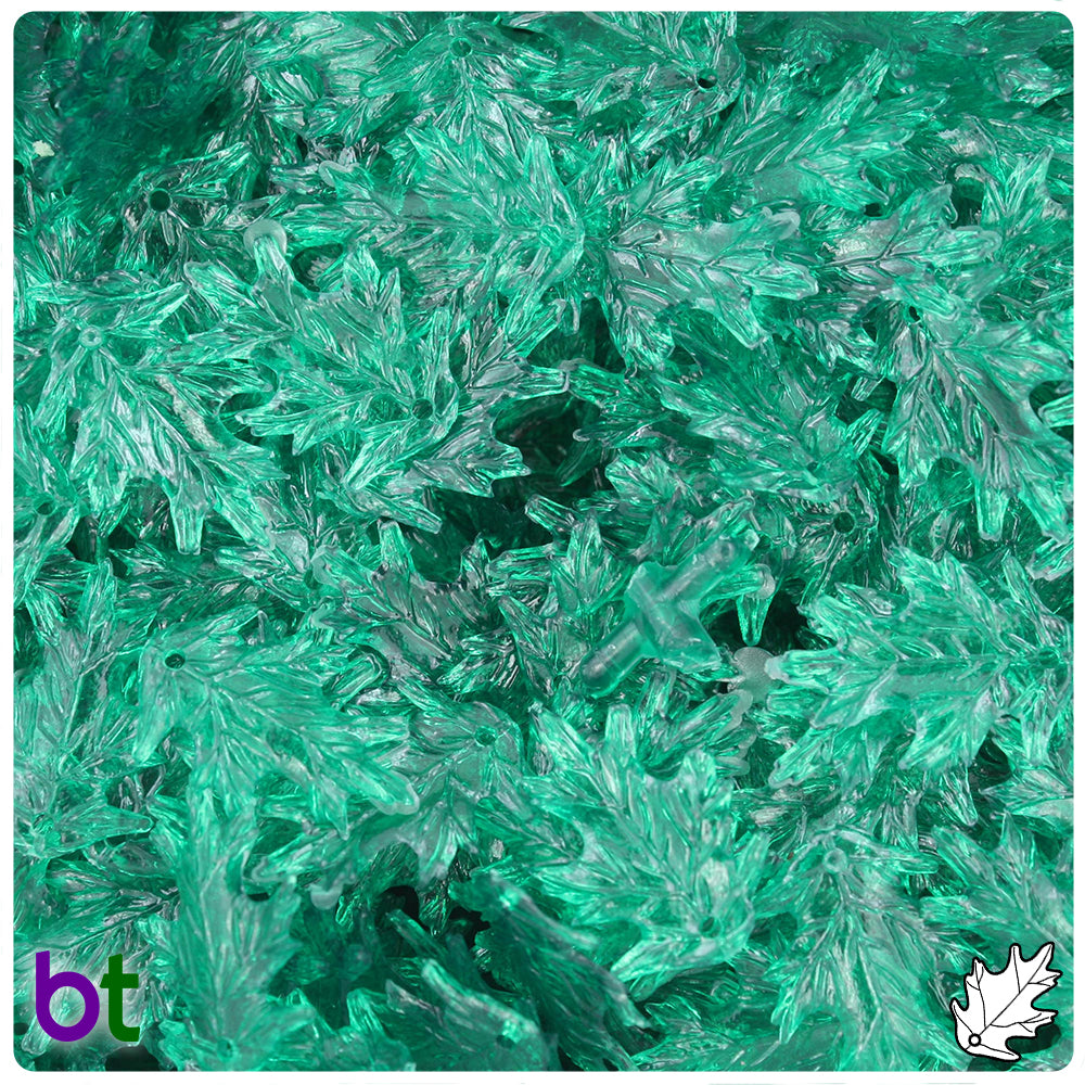 These forest green transparent oak tree leaves measure 20mm long by 14mm wide and have a 1mm hole in the end of the leaf. Our plastic craft products are made in the USA with high-quality plastic and come in packs of approx. 100 leaves.