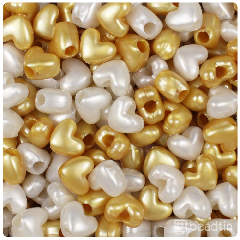 These gold & bridal pearl heart shaped pony beads measure 12mm wide by 10mm high and have a 4mm hole which runs vertically down the middle of the beads. Our plastic pony beads are made in the USA with high-quality plastic and come in packs of approx. 50 beads.